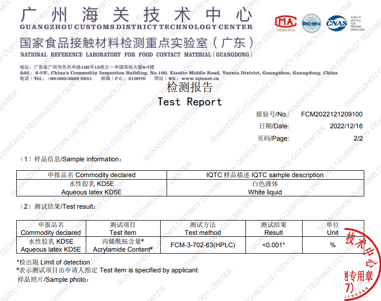 該膠水主要應(yīng)用于特種食品紙無氟防水、防油的涂膠。涂膠后的紙柔軟度、防水性、防油性、拉伸強度等指標(biāo)都達(dá)到特定的要求。該膠水按照ISO22000 標(biāo)準(zhǔn)要求生產(chǎn),符合美國 FDA 標(biāo)準(zhǔn)和歐盟 BRCGS 認(rèn)證。